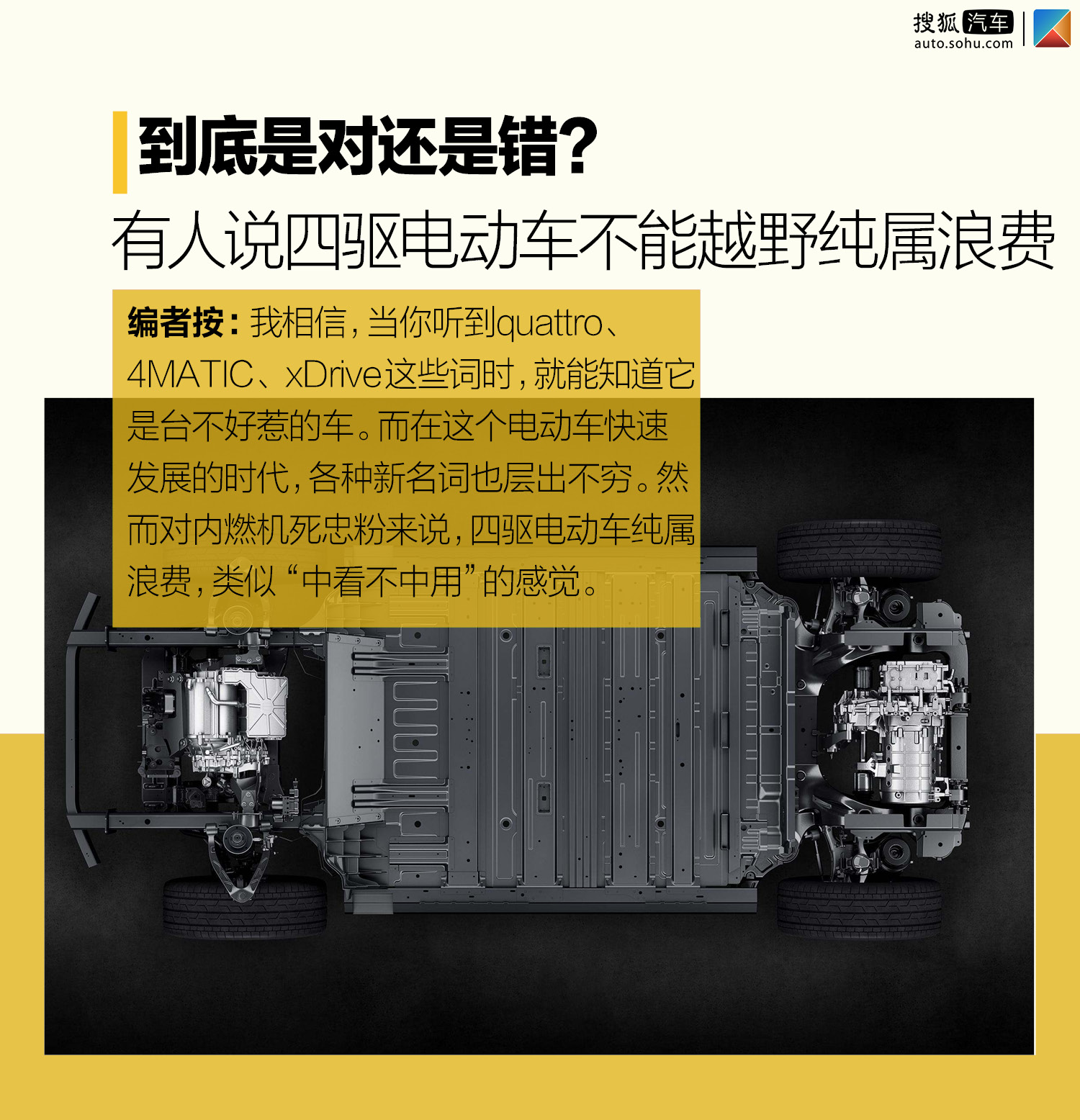 我相信,當(dāng)你聽(tīng)到quattro、4MATIC、xDrive這些詞時(shí),就能知道它是臺(tái)不好惹的車(chē)。而在這個(gè)電動(dòng)車(chē)快速發(fā)展的時(shí)代,各種新名詞也層出不窮。比如極速電四驅(qū)、E-FOUR、雙電機(jī)全輪驅(qū)動(dòng)等等,雖然名字五花八門(mén),但個(gè)個(gè)也都是狠角色。然而對(duì)內(nèi)燃機(jī)死忠粉來(lái)說(shuō),四驅(qū)電動(dòng)車(chē)純屬浪費(fèi),類(lèi)似“中看不中用”的感覺(jué),今天我們就從機(jī)械結(jié)構(gòu)和實(shí)際感受兩方面聊聊這種想法是對(duì)還是錯(cuò)。