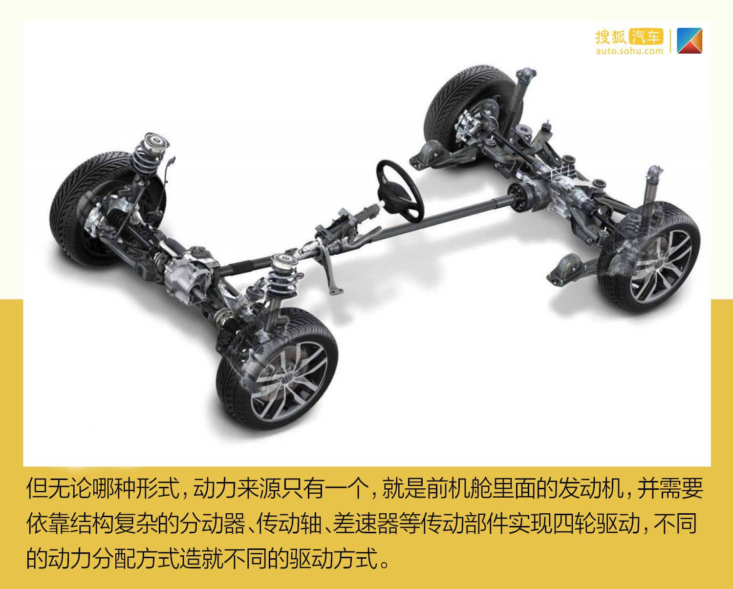 雖然兩者的最終目的都是實(shí)現(xiàn)四驅(qū)功能,但燃油車(chē)和電動(dòng)車(chē)的四驅(qū)結(jié)構(gòu)有著天壤之別。傳統(tǒng)燃油車(chē)分為分時(shí)四驅(qū)、適時(shí)四驅(qū)和全時(shí)四驅(qū)三種類(lèi)型。其中,全時(shí)四驅(qū)意味著四個(gè)車(chē)輪在任何情況下都有動(dòng)力,但每個(gè)輪子的動(dòng)力分配會(huì)根據(jù)不同情況進(jìn)行分配;分時(shí)四驅(qū)則為手動(dòng)控制,四驅(qū)連接時(shí)四個(gè)輪子驅(qū)動(dòng)力一致,無(wú)法改變;適時(shí)四驅(qū)則為在需要的情況下給予四驅(qū),平時(shí)以?xún)沈?qū)為主。但無(wú)論哪種形式,動(dòng)力來(lái)源只有一個(gè),就是前機(jī)艙里面的發(fā)動(dòng)機(jī),并需要依靠結(jié)構(gòu)復(fù)雜的分動(dòng)器、傳動(dòng)軸、差速器等傳動(dòng)部件實(shí)現(xiàn)四輪驅(qū)動(dòng),不同的動(dòng)力分配方式造就不同的驅(qū)動(dòng)方式。