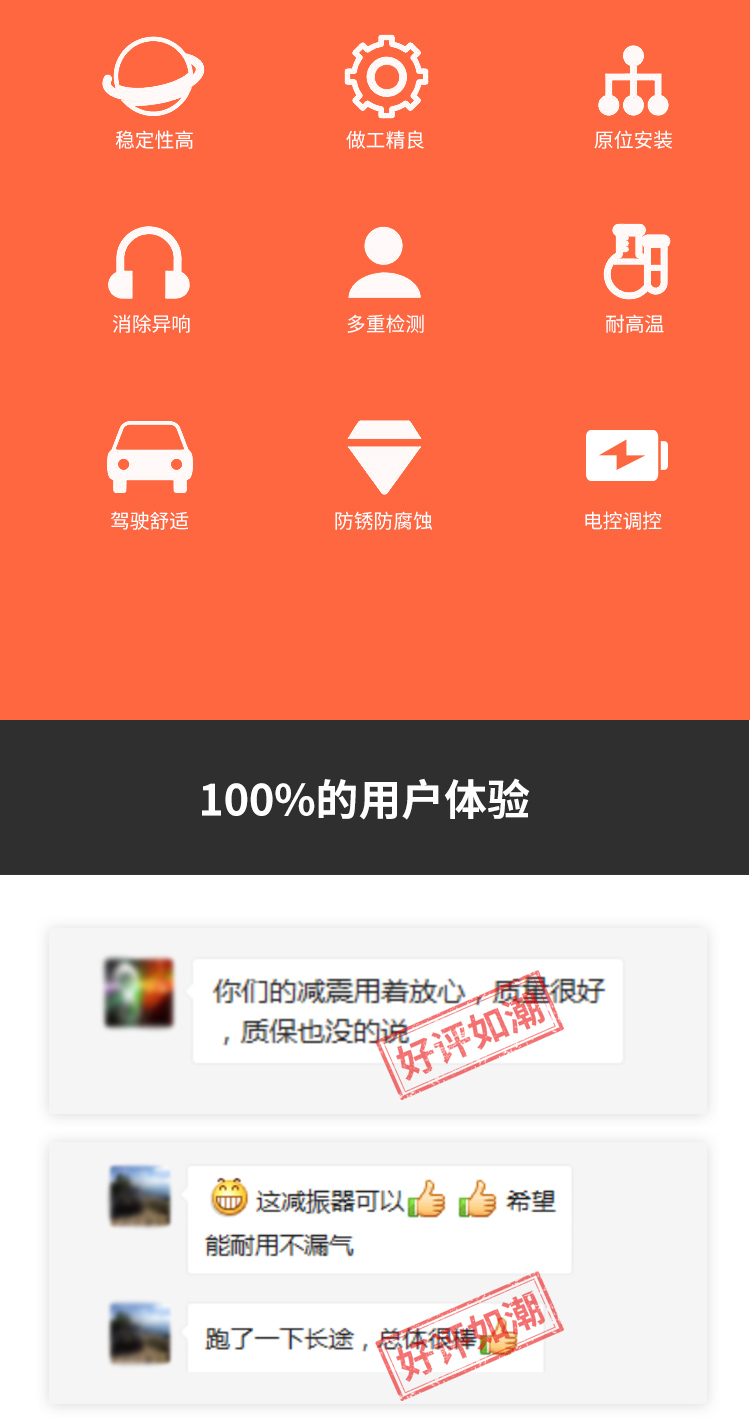 越野減震器:質(zhì)保一年!一年內(nèi)因產(chǎn)品品質(zhì)原因造成漏油,可享免費(fèi)質(zhì)保服務(wù)